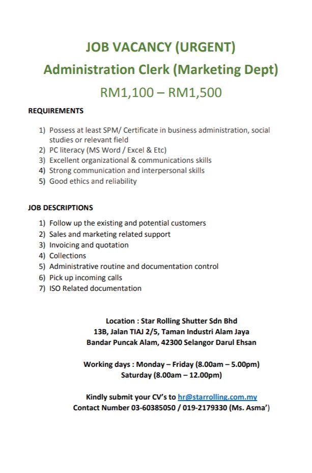 Nurul Asma Abdullah On Twitter Job Vacancy At Puncak Alam Administration Clerk Help Me To Rt This Thank You Maukerjamy Oh Kerjakosong Https T Co Yhy251f2la Twitter